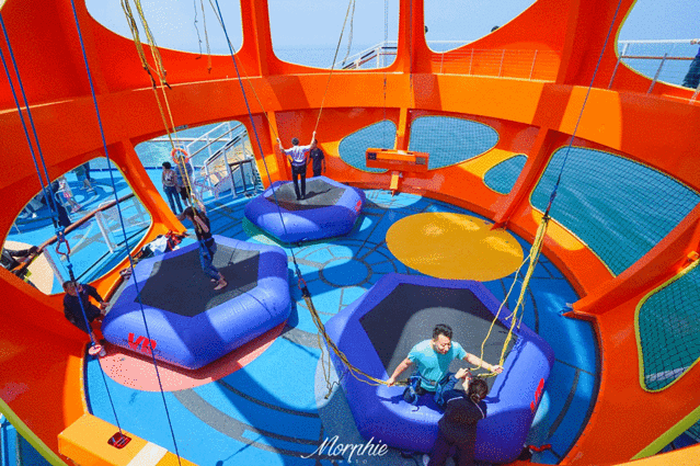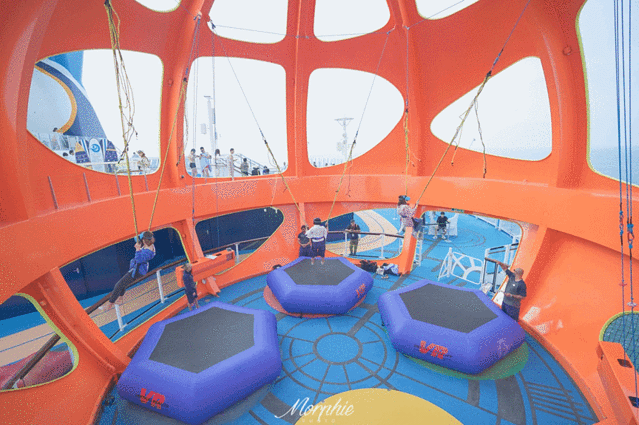 南极球位于船尾,与北极星遥遥相对。南极球中的四个蹦床给我带来了一次奇妙的穿越地心之旅。在四个蹦床上可以体验到三款刺激的游戏:机器人拉力赛、糖果跳跃赛和贝斯保镖。戴上VR眼镜,在蹦床上弹跳翻转,体验从北极自由落体到南极瞬间失重的感觉,我的心仿佛都要跳出来了!