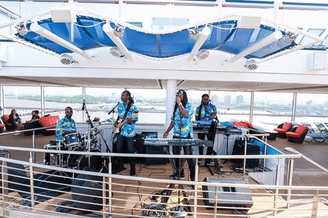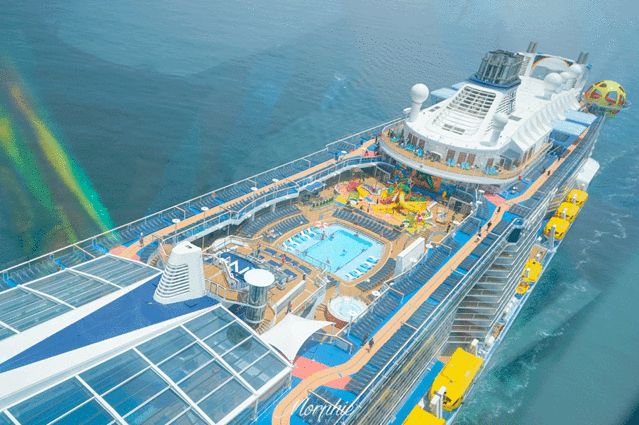 海洋光谱号的外观首先就深深吸引我。300多米长、40多米宽的海洋光谱号好似一条巨龙在海里劈波斩浪。船上的泳池、客房、餐厅、游乐设施一应俱全,无论是大人还是孩子都能在这里找到自己的心头所爱。宽阔的甲板上横放着一排排的躺椅。在泳池中玩够之后,斜靠在躺椅上,慵懒的伸一下腰,旁边摆着一杯从服务小哥那里点的加冰的cinder,伴着微微的海风和暖暖的阳光,喝上一口,顿时觉得说不出的舒爽。孩子就在身旁嬉笑打闹,不仅感慨一句:“这才是真正的度假啊! ”