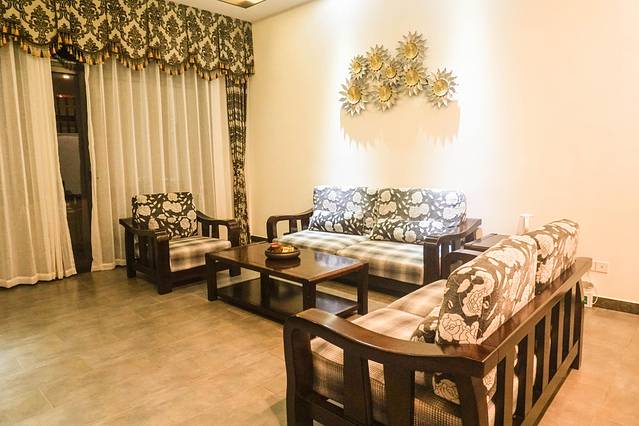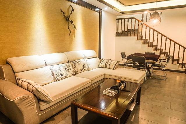 简约大气的别墅里面有三层楼,负一层设有卡拉OK,麻将房,外面还有露天的温泉池。一楼就是客厅、餐厅、厨房,双床房间,另外还有3个房间都在2楼。