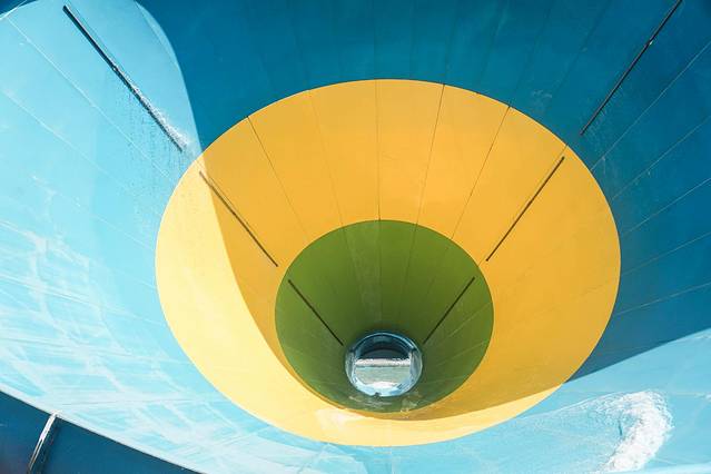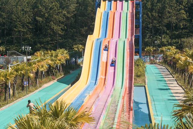 远远看过去彩虹滑道就像是林中的彩色小山峰,五彩缤纷的,好看至极。它颠覆了传统的滑梯,不是坐着顺滑而下,而是趴在滑垫上,顺着水流穿过一个又一个“小驼峰鼻”感受坠落的刺激感,我体验的时候,全程都是紧闭双眼,安全员说到后面可以用手抬一下滑垫,会减速暂停。这是安全小tips哦。不妨和朋友一起玩,比一比谁滑得更远吧!