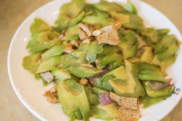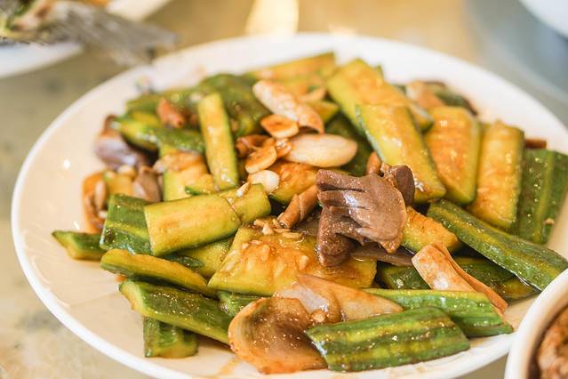 恩平的大师傅都很喜欢把蔬菜和肉类混合一起炒,这吃起来很独特,但是不奇怪。鸡杂脆口爽,丝瓜鲜美甜