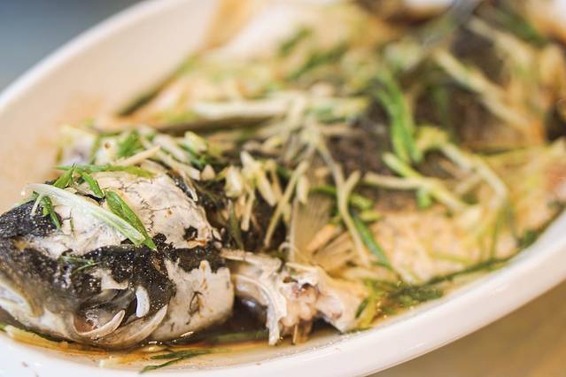 这个鱼吃起来无非就是特别鲜甜,主要胜于取材好,取材够新鲜。这鱼是师傅从水库鱼买回来的,放养在山泉水里,不喂食,让鱼变得更加清新干净。在清蒸的传统调制下,撒上葱花姜丝,普普通通的做法,却能感受到鱼肉的滑嫩。