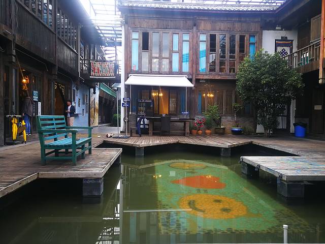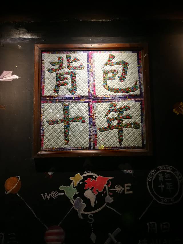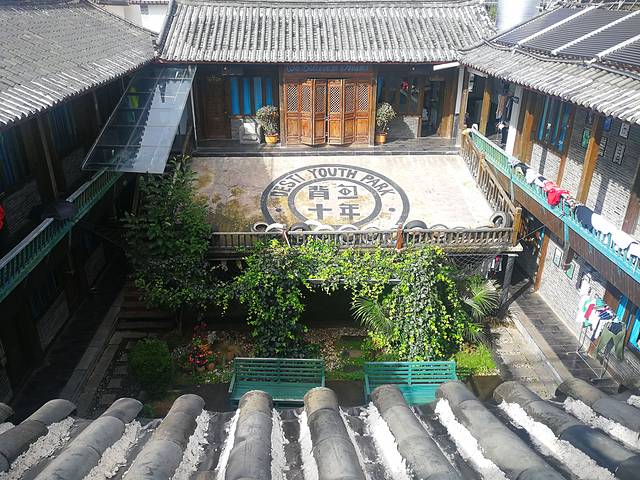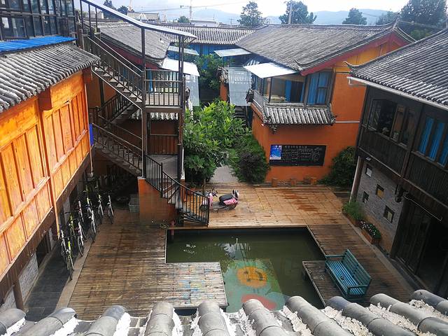背包十年在束河古镇算是颇有名气,很容易打听到。客栈类似一个狭长的四合院,院子中央一方水塘,吧台厨房行李房售卖机围绕在水塘周围,水塘同时也把院子分成了两个相对独立的部分。往东是男生院子,西边是女生院子。女生这边院子比东边大了些,房顶上四个大字“背包十年”格外醒目,放映机就设在女生院子的二楼,大荧幕就挂在对面一个小舞台的上方。整个二层走廊都有加了座椅的木围栏。