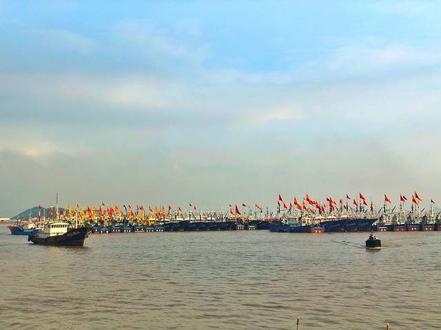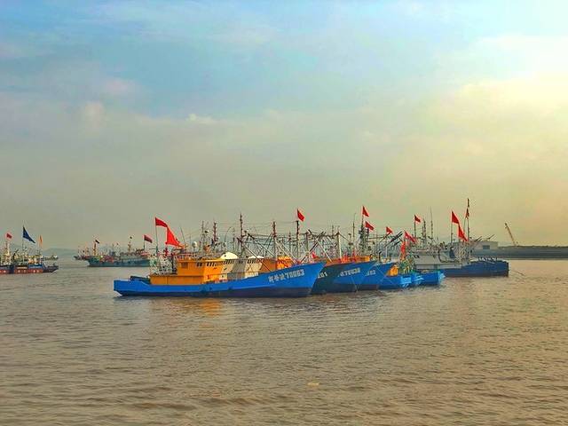 舟山不仅山多,海也多,初秋时节已经不适合下海踏浪,海水退潮之后,来沙滩吹吹海风,听听海浪也是不错的选择,黄昏照耀下的船只整齐的排列着,一面面飘扬着的五星红旗成了一道靓丽的风景线
