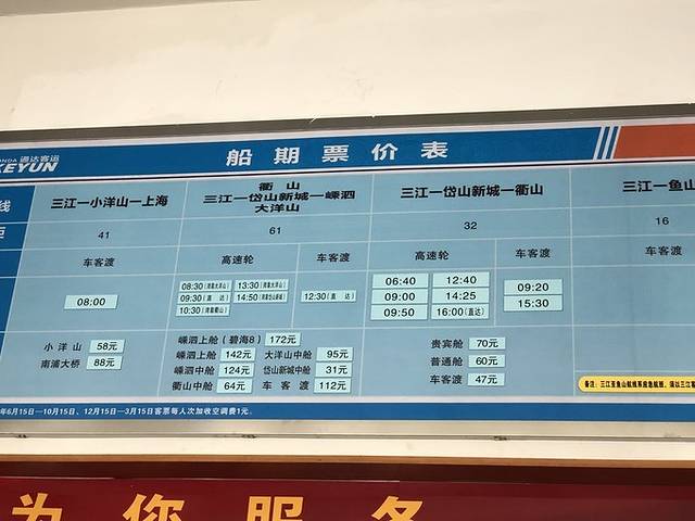 为了能顺利上衢山岛,我们想着顺路去三江客运码头提前买好票,到时候来了之后直接上船就行了,到达之后才知道轮渡的票只能当天买当天用,不能提前预定,本来有买不到票的顾虑,看到码头人不是很多这个顾虑也就打消了,虽然没买到票,提前熟知下码头的时刻表还是有必要的,以便我们提前规划路线和时间