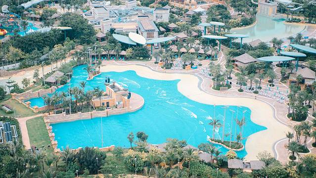 但对于很多男孩子来说,喜欢水世界的更多一些,因为这里才是体验速度与激情的地方,从酒店俯瞰下去,就知道这里并不小,每天开门营业以后,就有源源不断的客人进来,伴随着音乐和尖叫,这里开始了一场又一场的娱乐项目。