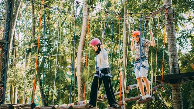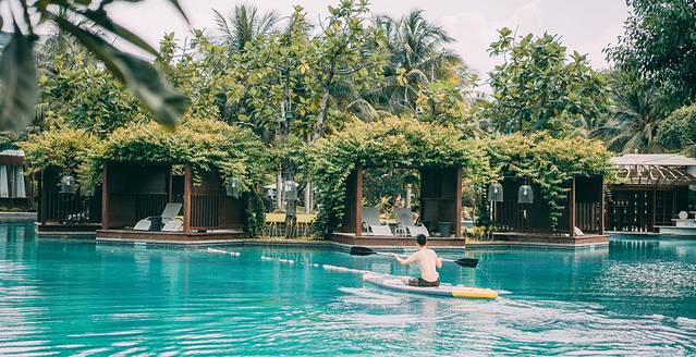 因为天气不太好,所以我们是玩了一下泳池的项目,皮划艇什么的,可以沿着泳池划一圈,大概400米的一个环形,两边是椰子树和槟榔树,中间还有石桥,吹着海风,也不算热,倒也是挺有意思的。