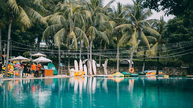 酒店除了房间以外,和其他度假酒店一样,也有很大的公共区域可以玩儿,什么游泳池、健身房、沙滩、草坪等等都有,尤其是泳池,据说是三亚最大的户外泳池,超级大,大到可以在上面玩一些项目。