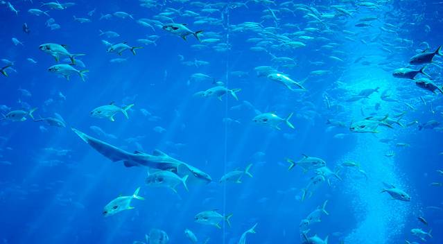 而在进入水族馆以后,你会发现这里有很多的热带海洋鱼类,大大小小,什么品种都有,有的五彩斑斓,小的像虾米,有的黑黑的几乎看不见,却又大的像鲨鱼。