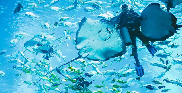 而最让人兴奋的,大概就是这里可爱的魔鬼鱼,每到饲养员投食的时候,他们会一起出现在观众眼前,伴随着动人的音乐,让人忍不住跟着摇摆起来,而这个时候,也是大家拍照的好时候,小孩子还可以在最前面和他们合影,拍出美美的照片。
