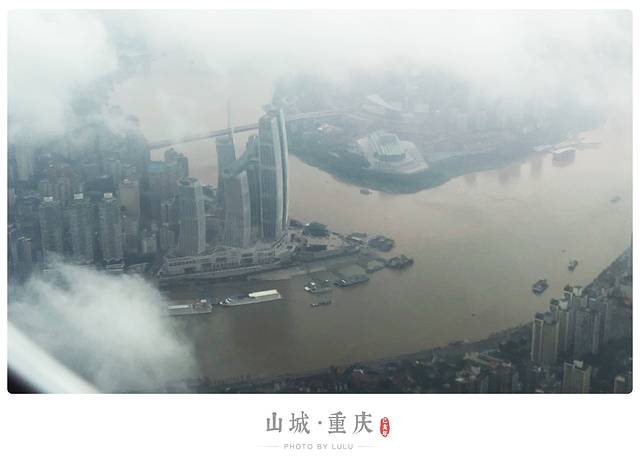 穿越厚厚云层,从飞机上俯瞰重庆这座城市一隅,朝天门是最先进入眼帘
