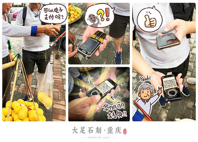 在大足石刻景区门口卖黄桃的大爷~超级可爱~我们问他有电子支付吗~他说有!然后只见老伯掏出他的老人机递到ak眼前...哈哈哈哈,我们顿时傻眼了~然后ak疑问的问,这机子能用微信和支付宝?随即,大爷反手就是一个巴掌,哦不,大爷伸手把手机反过来,大大的二维码顿时出现在我们眼前~