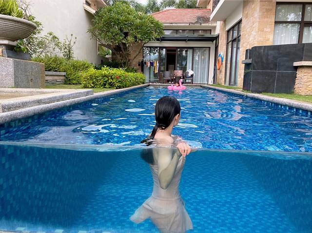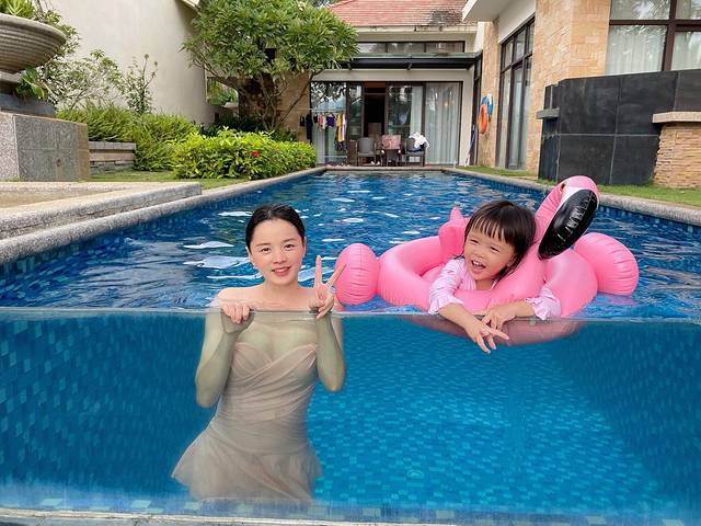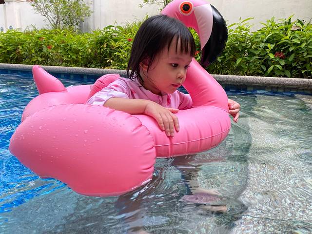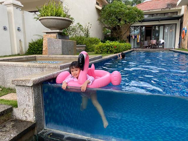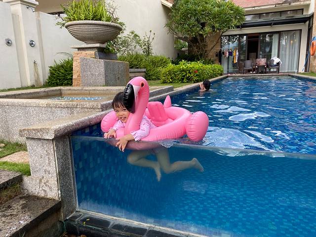 入住泳池别墅怎么可以不好好享受它的设施,午睡之后的时光我们都是在酒店休息,小朋友最爱的火烈鸟泳圈是我从 宁波 拖来的,带上打气筒一点点给她吹鼓。
