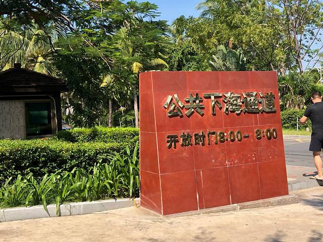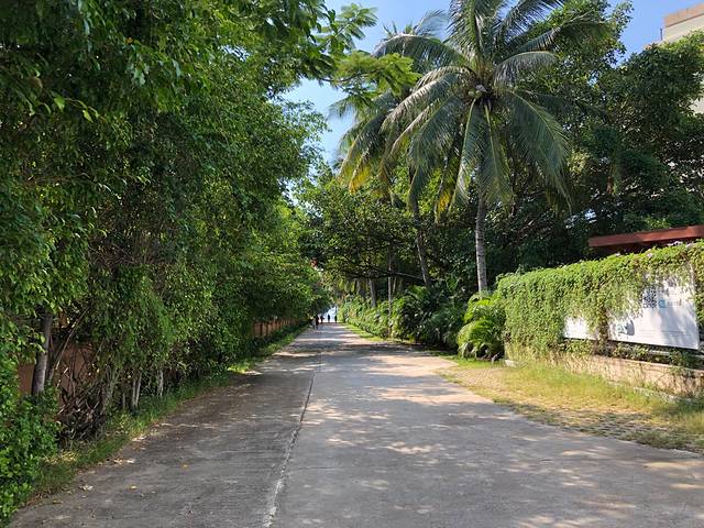 电瓶车不能直接到沙滩边,是停到这个路口的,穿过一条林荫小道就到了"天下第一湾" 亚龙湾 了。