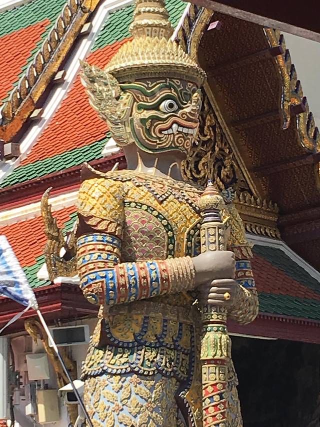 到达第一个景点—大皇宫,每位来曼谷的游客必打卡的一个地方,5月正值太阳照,一下车才算真真体验到泰国的炎热,满头汗,晒的火辣辣的。大皇宫在曼谷中心,紧靠湄南河,是曼谷王朝的象征(一般游览大皇宫+玉佛寺)开放时间是8:30-15:30,需要门票国外游客500泰铢,泰国人免费,若遇王室仪式时闭关。注:大皇宫对参观者服装的要求,超短裤/裙,无袖或背心,紧身衣不能穿在外面,透明的衬衣上衣不行,拖鞋等露脚后跟的不可以船。如果穿着不符合规定,可以在入口的柜台免费租服装。