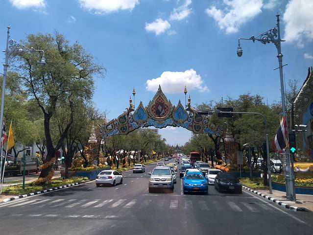 吃的饱饱的,开始我们的行程啦,前往曼谷著名的大皇宫(玉佛寺),途中经过泰国的大街小巷,看着路边的天湛蓝湛蓝的,坐着空调车,心凉爽爽的