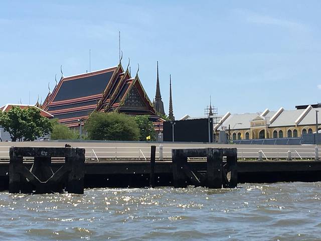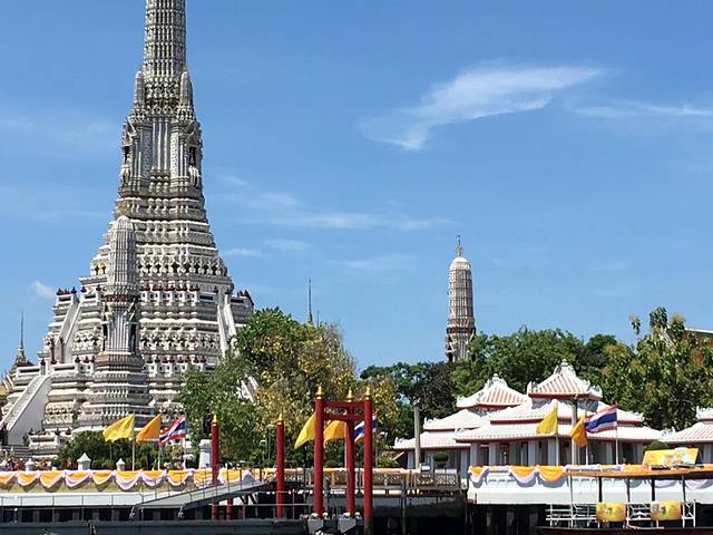 随后步行过街(在大皇宫外围有很多小贩,推着小车卖水果:红毛丹,菠萝等,各种可口的汽水)到达湄南河边坐船家的长尾船,基本都是团队游坐这个船,一团一船,船家会给每位上船的游客带一串花(把祝福送给你)顺手给个小费20泰铢,天气虽然炎热,但是河风一吹,蛮凉快的(途中手机可得拿紧啦,船一快一颠,不定就飞出去啦,那就只有哭啦)湄南河有泰国“河流之母”之称,同时也是被誉为“东方威尼斯”在泰国的城市运输以及岸边居民生活中扮演着重要的角色。沿途有一个著名的景点—郑王庙,船游就只能远观了。