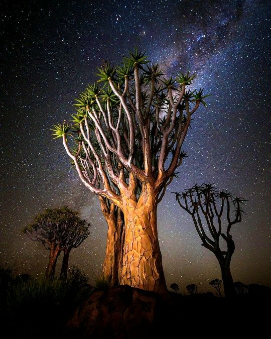 箭袋树,看上去像树,但其实是一种非洲南部的芦荟,因布须曼人常将砍下的树枝掏空用做箭袋而得名,这些树高达7-9米,拥有200年左右的历史啦。