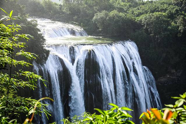 陡坡塘瀑布位于黄果树瀑布上游1公里处,是黄果树瀑布群中瀑顶最宽的瀑布,也是86版《西游记》片尾曲取景地。从门口沿着步行栈道往里走十几分钟,就能看见陡坡塘瀑布了。越走近瀑布,耳朵边能听见的“轰隆隆”声音就越来越大,浑浊的河水从瀑布的溶潭上方倒灌下来,伴随着巨大的吼声拍打在石头上溅起串串水珠,最后再倾泻在横跨100多米的钙化滩坝上,四散开去。