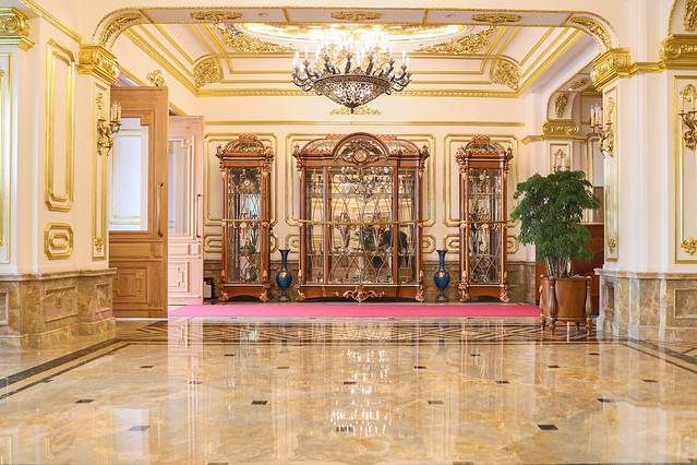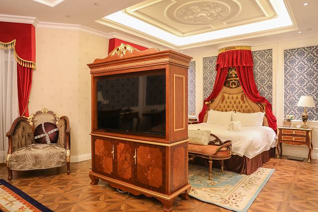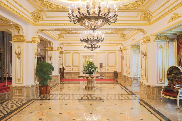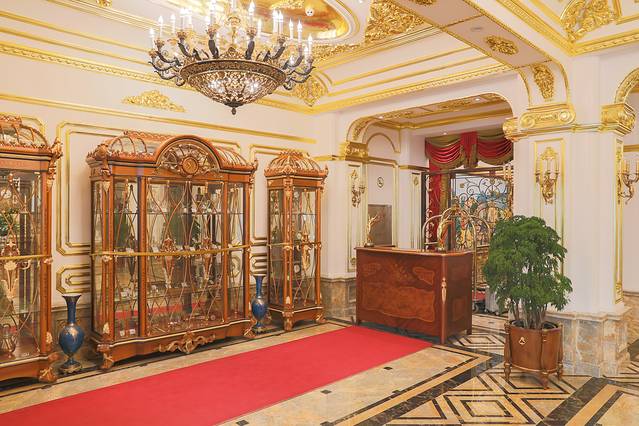 推开酒店的大门,俄式装修风格透露出贵族的奢华气质,老式上弦唱片机鸣奏着旧时光的优雅音律。漫步于富丽堂皇的长廊,俄罗斯古董和油画静静述说着百年的故事。