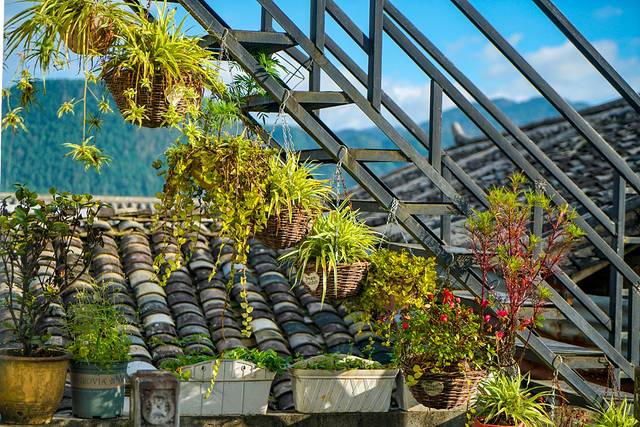 慢慢的走进村寨内,庭院门前满是花草,绿树成荫。磨南德村处于半坡上的,进村也就是下山,每户人家不同位置和范围的瓦屋将形成整个村落,同时也将整个村落排得像是个迷魂阵。