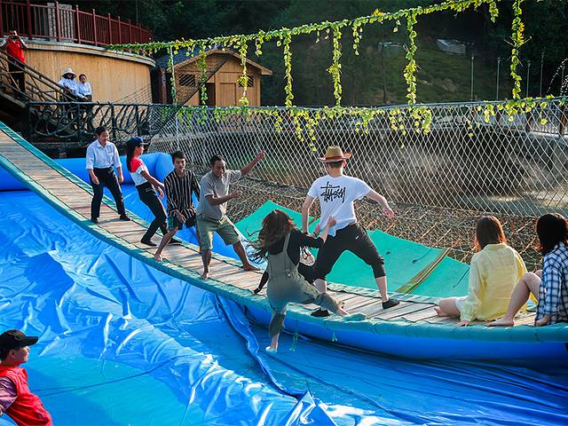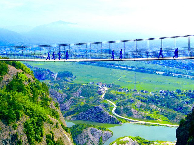 全透明高空玻璃桥长约300米,垂直高度达180米,相当于四五十层楼房的高度,走在上边已经颤颤巍巍了,还要挑战背媳妇竞技?简直是考验勇气与体力!