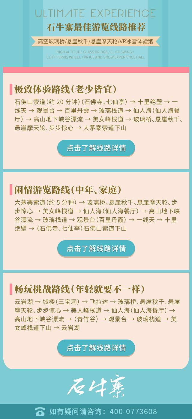 Tips:目前石牛寨还推出一款超实惠亲子票,仅需198元/1大1小(14岁以下儿童)(门票+玻璃桥+上行、下行缆车+步步惊心+告白喊泉+玻璃栈道)*赠送悬崖秋千+悬崖飘椅