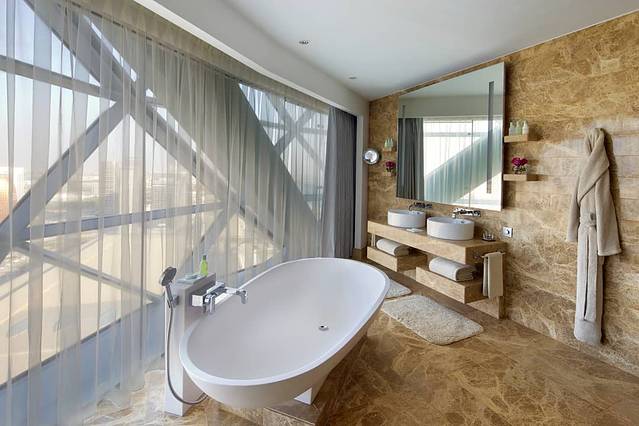酒店外观奢华大气,玻璃化的镜面外观,搭配海、陆、空、以及沙漠的混合设计风格,和沙漠自然景观中的舒缓色调,既雍容华贵又高雅迷人。每个房间都有全景式的落地窗,你可以360度无死角的欣赏到阿拉伯湾和阿布扎比市天际线的景致~令人更惊喜的是,这里的服务员会中文哦~