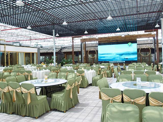 午餐在生态餐厅吃的,益阳现代农业嘉年华的生态餐厅面积约有3000平米,共有包厢18个,可同时容纳600人就餐,其中14个普通包厢以益阳市周边乡镇命名如“欧江岔”“龙光桥”“碧云峰”等