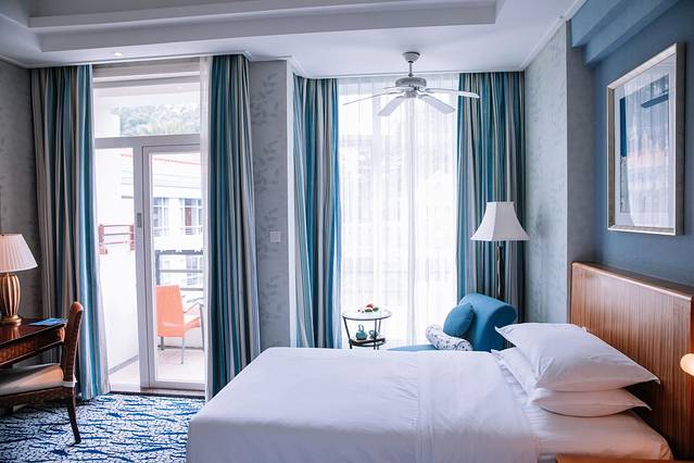 入住到亲水区是第一件开心的事,推开房门的时候让我心动了一下,整个房间的色调是水蓝色,宽敞舒适,没有过多的装饰,很切合我的喜好。床铺也有独特的蓝色元素,与纯白的床单和蓝白相间的地毯相呼应,再加上原木色的家具,色系搭配给人更加贴近生活的感觉。