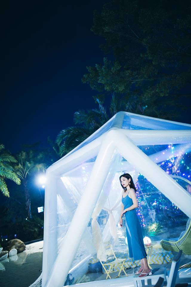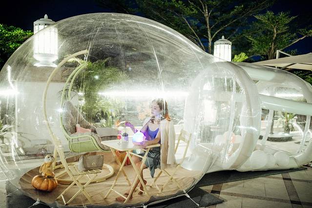西餐厅外是一个开发的露台,摆放着造型别致的充气泡泡屋,屋里摆上桌子和吊椅,梦幻又浪漫,满满的ins风,也成了酒店的一个拍照打卡点。享受完美味的晚餐,去里面拍拍照或者小憩一会,都很惬意。