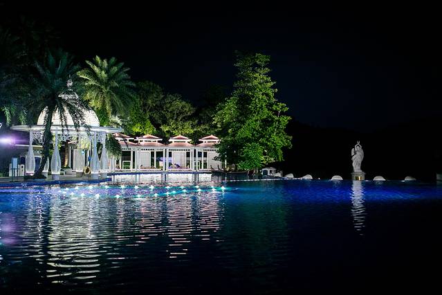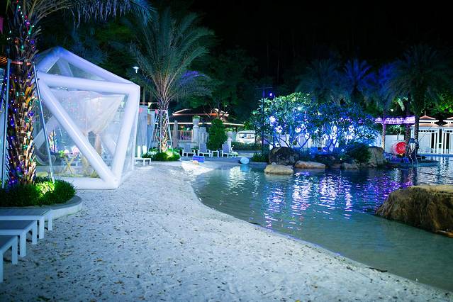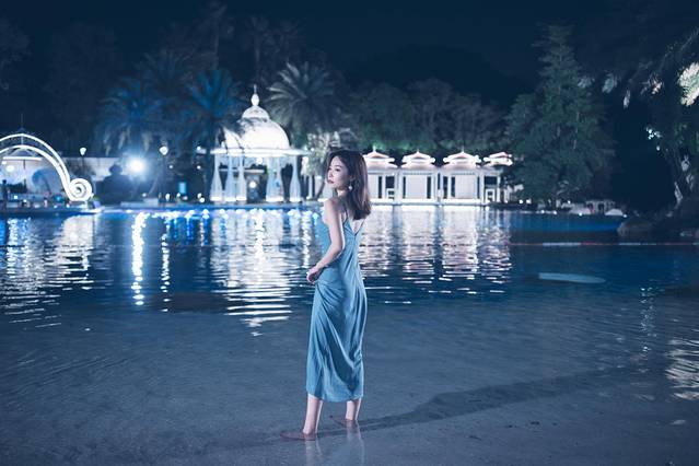 原本计划晚上要到温泉区泡泡温泉,却被温泉区的浪漫星空的氛围吸引了。远远的望着温泉区亮着灯,星星点点的。走进后才发现温泉区的周边挂满了灯饰。身旁是星星点点的灯光,抬头是皎洁的明月,脚下是粼粼波光,仿佛是置身在美丽的星空中。悠扬的音乐声,浪漫的星空,说着悄悄话的情侣,好像空气中都是满满的甜蜜味道。