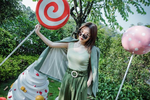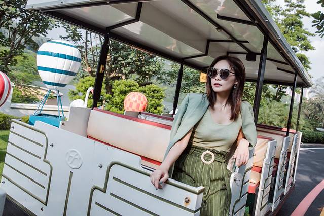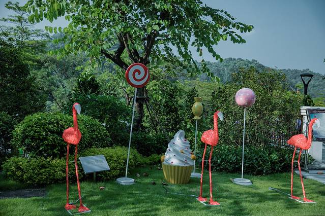 小火车放慢速度行驶,经过客房区,经过绿树成荫的沿湖路,经过童趣十足的彩虹跑道……夏末初秋的高温对这里似乎格外温柔,没了想象的燥热,反倒是微风徐徐,空气也如此的清新宜人;路边的绿化并不是千篇一律,火烈鸟、棒棒糖、冰淇淋,各种的装饰给绿色的世界增添了些活泼,每一次的回眸都有不一样的感受。