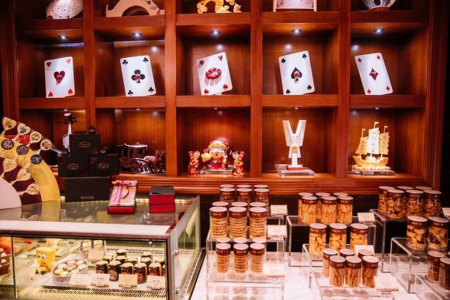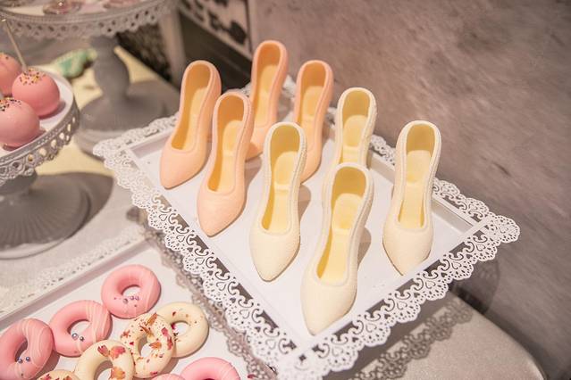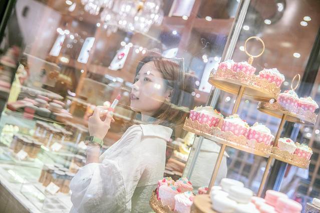 大堂一旁是巧克力屋,路过的时候忍不住看了两眼。竟然将巧克力做成了高跟鞋样式,口红样式……各种颜色鲜艳的甜甜圈、马卡龙,让整个空气里都弥漫着少女的气息。