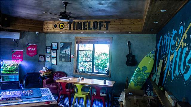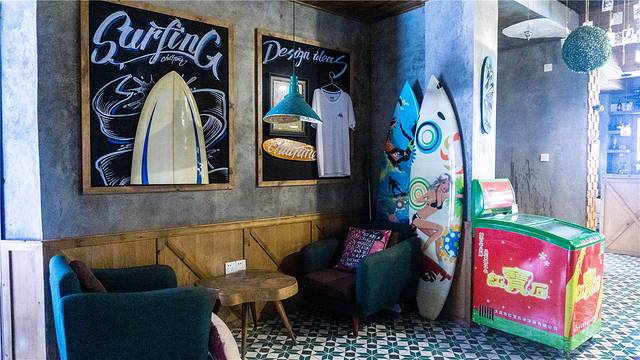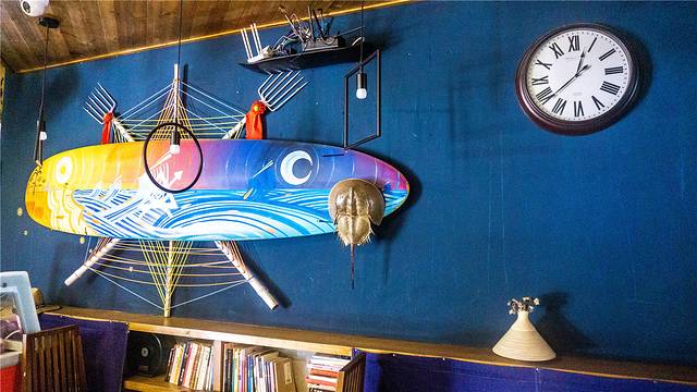 大厅的布置很简单,但又不那么平淡,水泥灰的墙面上挂着各式各样的奖项证书,都是房东去参加冲浪比赛后留下来的,斑驳的沙发旁几顶沙滩帽随意摆放着,一块冲浪板倚靠在涂鸦墙上,上面就是一把吉他,一个身着背心短裤,头戴草帽,面朝大海脚底细沙,手里弹着吉他的不羁青年的形象呼之欲出。
