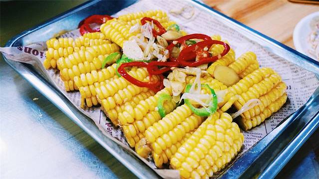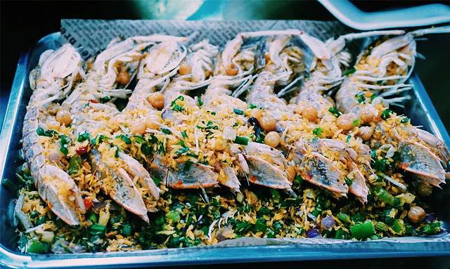 烤玉米非常的香甜,让人忍不住一再向它下手,还有蒜蓉蒸龙虾,虾肉一大块很有嚼劲,满满的鲜美。