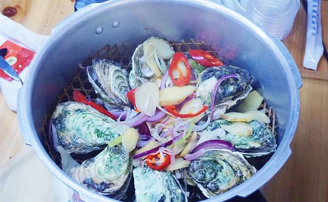 在我们吃的正尽兴的时候,白菜从旁边端上来一个还热气腾腾的高压锅,这就是我们的高压锅生蚝了,只见白菜和另一位店员站好,拔掉了高压锅的气阀,嘴里大声喊出“今晚吃蚝,祝您豪气冲天!”,蒸汽直冲天花板,这充满仪式感的方式让我对锅里的生蚝满是期待。还是白菜,戴上手套用工具一个个把生蚝撬开摆在盘中,边上备好了蘸料和柠檬水,吃之前先蘸一下柠檬水再蘸酱料,一口咬下去,没有让人难以忍受的铁锈味,就这样滑进了肚子里,仿佛猪八戒吃人参果一样,这样的美味让人想再吃几个尝尝到底是个什么味。