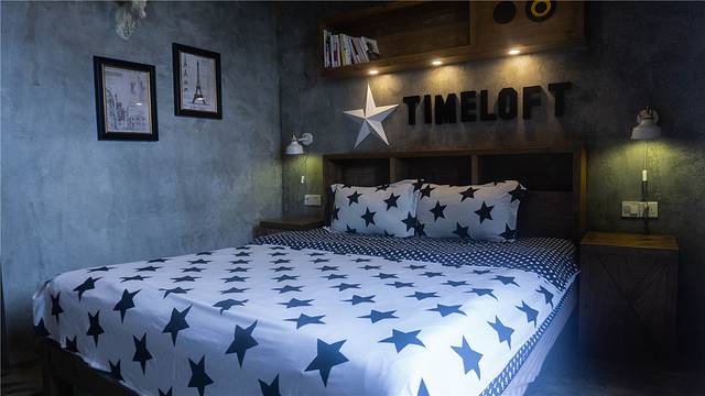 房间里同样是水泥灰墙面,搭配木制的床头柜,怀旧的风格令人惊艳,斑驳的主题也让人很有温馨的感觉。