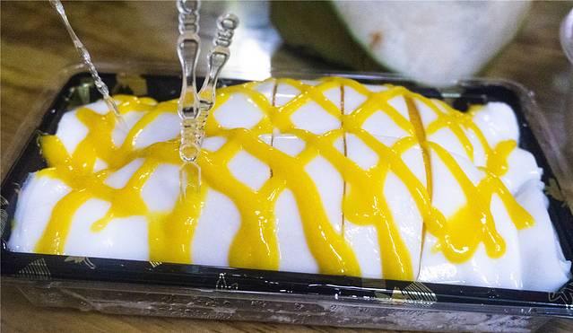 这道一下子就能吸引到我的目光的就是芒果肠粉了,用叉子轻轻叉起来你可以看到洁白的肠粉里面包裹着一大块芒果果肉,一口塞到嘴里,汁水四溢。能够这么爽的吃芒果的机会不多,这道菜正好可以让你免去自己动手的麻烦享受到直接大快朵颐的快感。