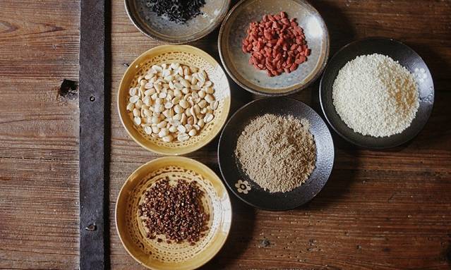 将茶叶、芝麻、花生、川穹、陈皮、鸡尾草等原料放入“擂钵”中