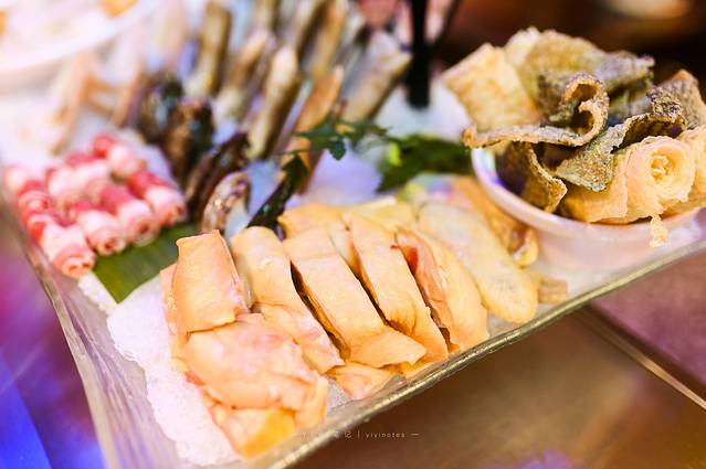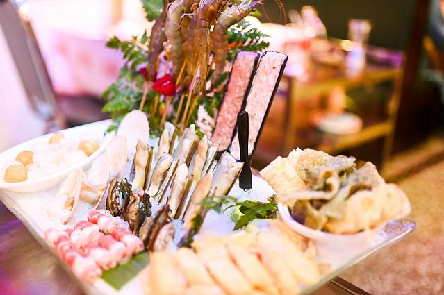 点菜时首选的当然是店里的招牌菜——金牌走地花胶鸡,如果还纠结吃些什么,点一份海鲜拼盘准没错,有基围虾、肥牛卷、嫩鸡块、鲜鲍鱼、牛肉丸、鱼皮。