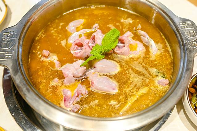 把美蛙都倒入汤内后,服务员还会放上一片薄荷,看着非常养眼。