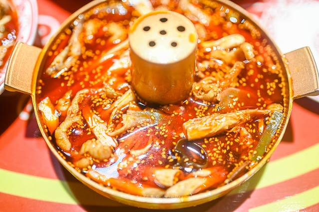 现点现烤的脑花,在红油中不断吸收秘制料汁的精华。出锅前撒上葱花提味和豌豆丰富口感,那香气简直上头。