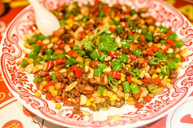吃过八宝粥、八宝饭,还是第一次吃到八宝辣子鸡。用勺子一勺下去,玉米、花生、红椒、青椒、鸡丁一起在口腔内打转,超级满足。
