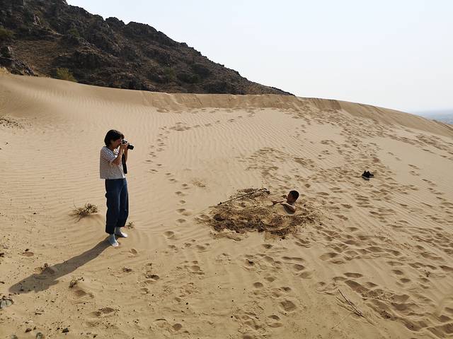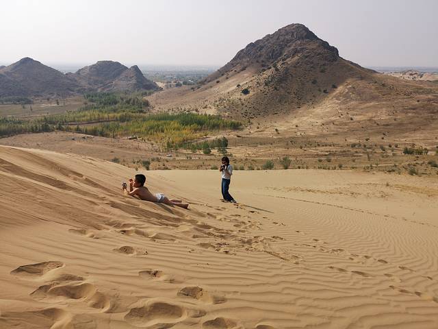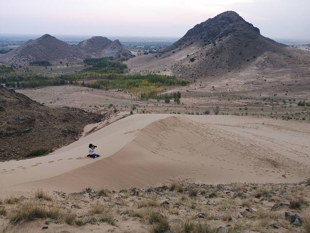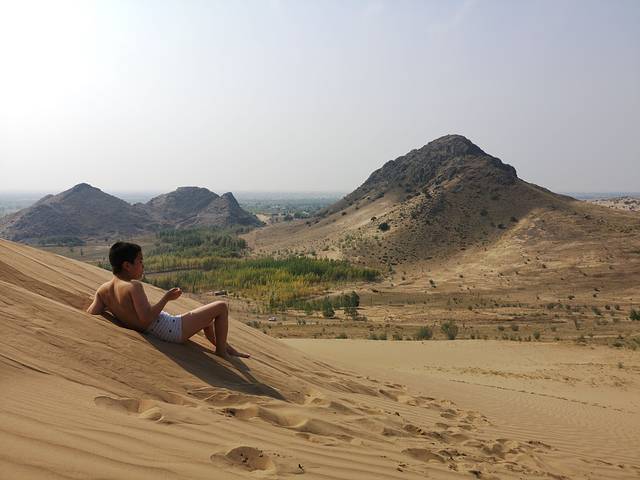 昨日我们一家来到了向往已久木叶山下,孩子在旁边的小山腰玩沙子,我登上了木叶山,孩她妈摄影。这是一座有故事的山,踏上白沙地,阳光明媚,青牛白马的的传说似乎离我们很近,我们呆到夜幕降临,远处刮起了沙尘,木叶山就这样屹立在苍茫的天地间,这才是我心中木叶山的味道。