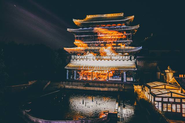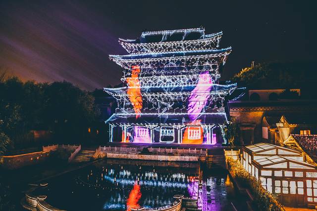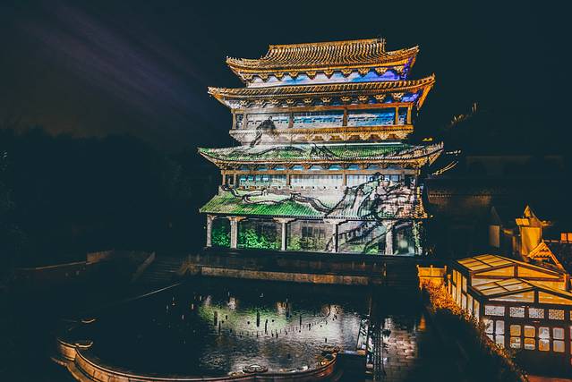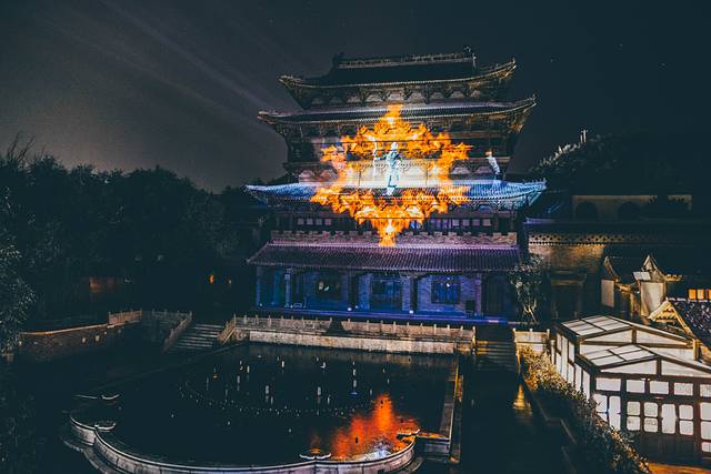 优美欢快的音乐,配合绚丽夺目的灯光,声与光的互动加上先进的投影技术,把望京楼变成了一座”魔楼“,这座魔楼不停的变换着各种绚丽的颜色,甚至改变形状,一会儿出现了一只振翅高飞的凤凰,一会儿又出现了一只上蹿下跳的 狮子 ,似乎望京楼活了一般,这是一场让人叹为观止的魔幻表演。