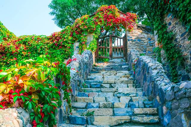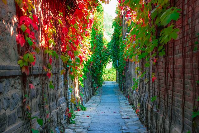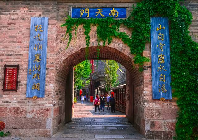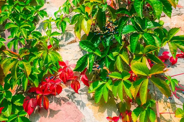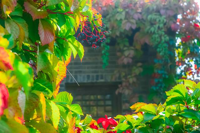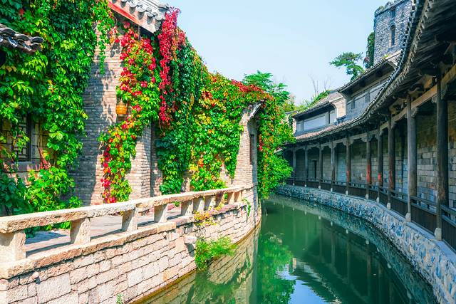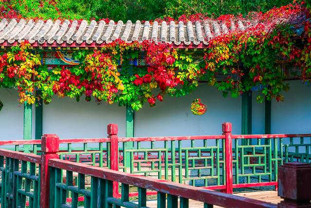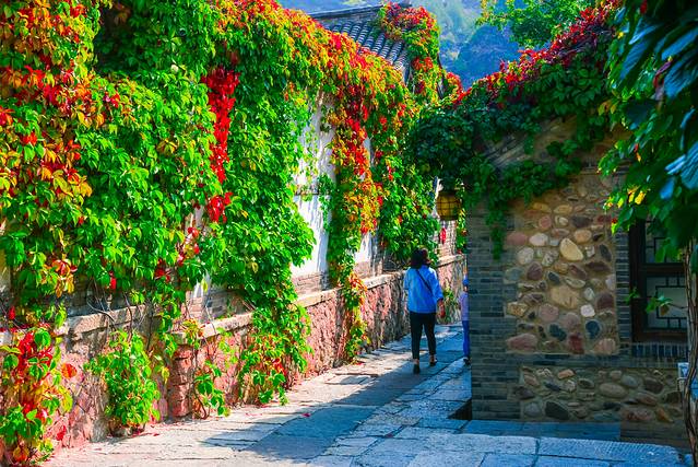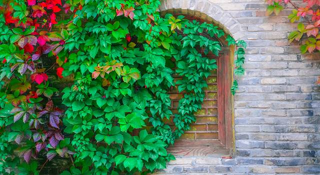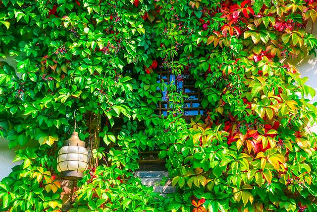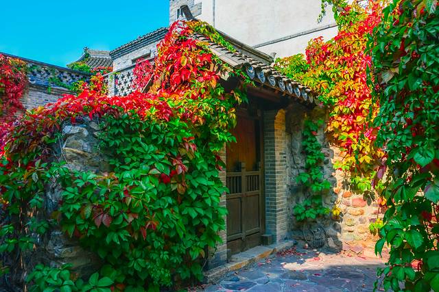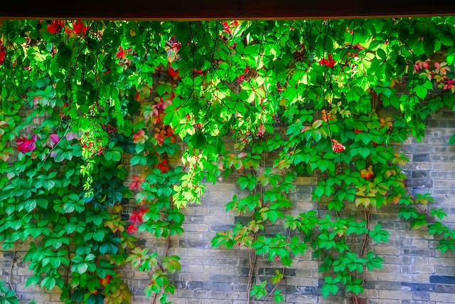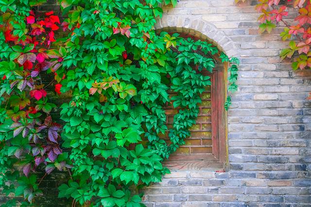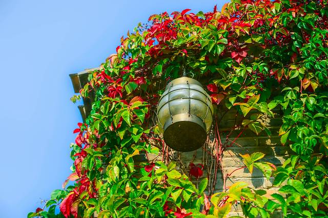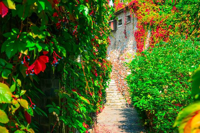 走小镇的青砖粉黛之间,火红的叶子爬满墙头,尽情地张扬着热烈和喧闹,仿佛要用尽力气,来渲染这个季节,而入眼的几簇绿意,依然有着令人兴奋的生机。