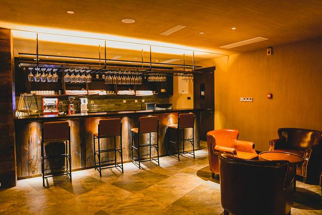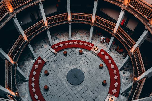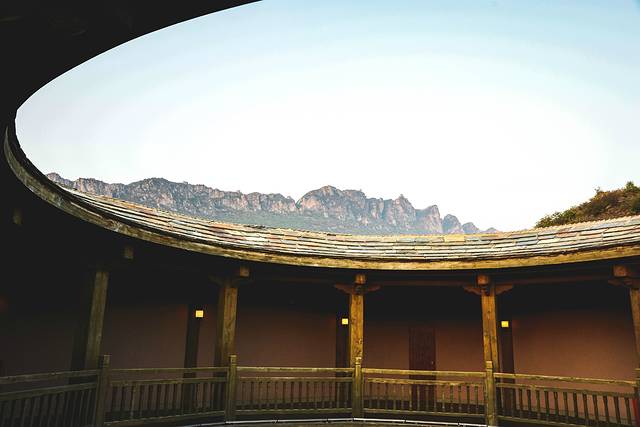 作为火塘酒店的“精神内核”,酒吧内置一露天火塘,火塘之上是土楼式的建筑留出的巨大圆形天井,营造出“顶光”的空间意境。踩着肌理温和的楼梯走上环形的回廊,脚下是浑然足音,头上是巨大的圆形屋脊线,而屋脊之上就是云海翻腾司马台长城。