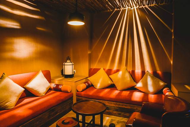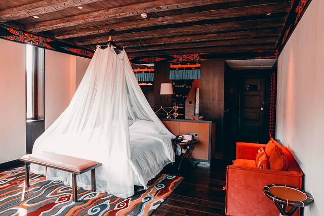 与其说这里是野奢酒店,还不如说是个行走间的文化博物馆。传统的建筑手法毫无保留的运用在火塘酒店的建设上,树皮覆面的墙壁融入自然环境,就地取材岩片屋顶落满阳光,而在坚固的土木的结构之间,光线如同实体一样被组织在里面。有光、温度、空间、材料、雾气,使得入住的体验非常丰富。