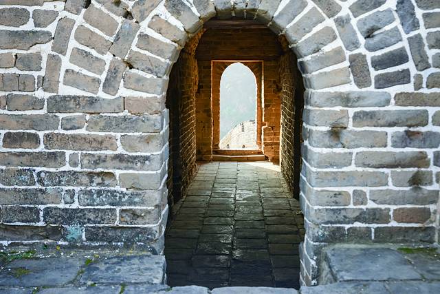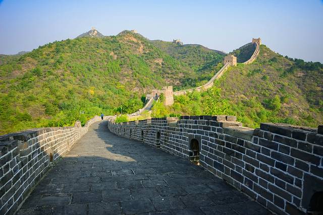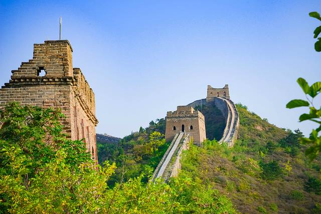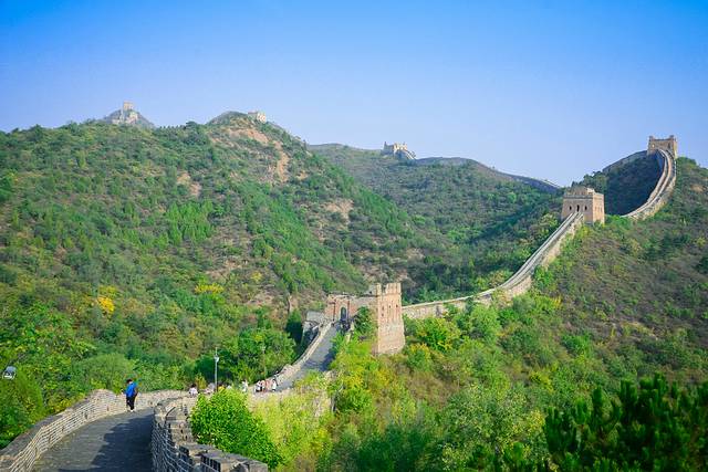 司马台长城蜿蜒于刀劈斧切的山脊之上,与湛蓝的天空划出分明的曲折线,带着历史拖着残旧的身躯,延伸至无尽的天际,宛如一条似要腾空而起的苍龙,环绕小镇向我们倾诉它的千年故事。